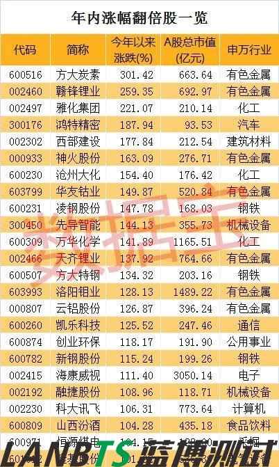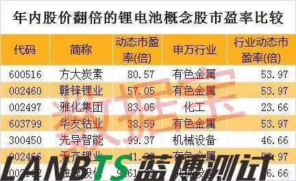 數(shù)據(jù)寶統(tǒng)計(jì)顯示,剔除近一年上市的次新股,25只個(gè)股年內(nèi)漲幅在100%以上。值得注意的是,7只個(gè)股來(lái)自鋰電池板塊,分別是方大炭素(600516)、贛鋒鋰業(yè)(002460)、雅化集團(tuán)、華友鈷業(yè)(603799)、先導(dǎo)智能(300450)、天齊鋰業(yè)(002466)、融捷股份(002192)。